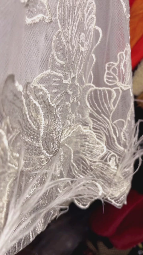 white floral lace fabric. Back zipper. White ostrich feathers at bottom of dress. Boning inside top.